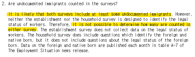 또한, 불법 이민자들을 노동 통계에서 완전히 발라내는 것이 어렵고, 실제로 BLS의 노동 통계는 불법 이민자를 따로 판별해서 집계되지 않습니다 (아래 BLS FAQ 참조).