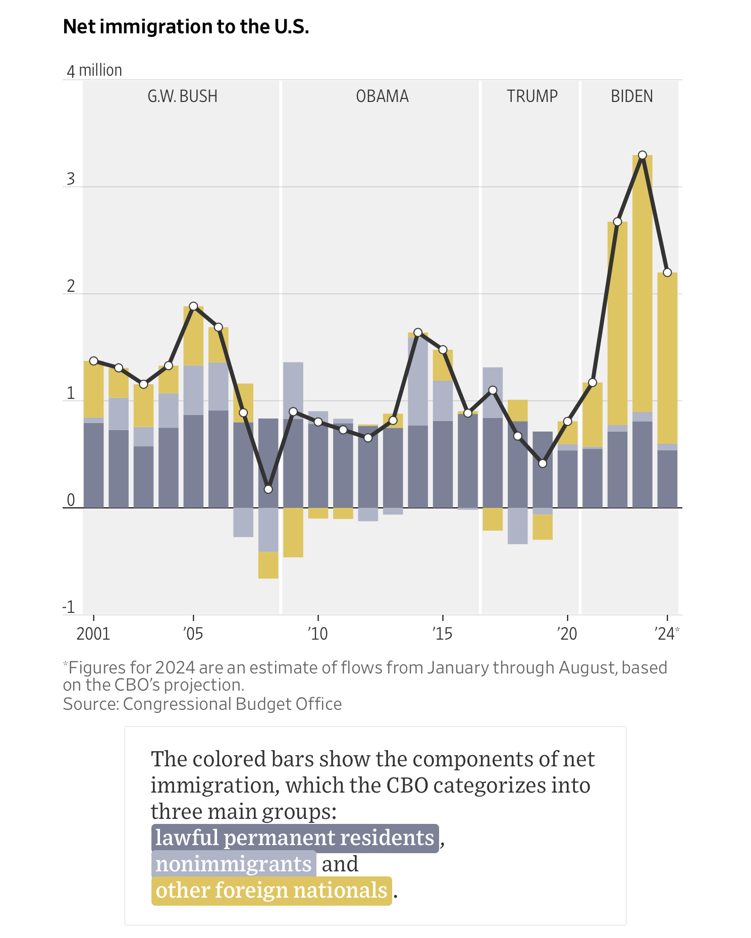 한 눈에 봐도 알 수 있죠? 바이든 정권 하에서 불법 이민자들이 얼마나 크게 늘어났는지... 그리고 이들에 의해 미국 노동시장이 큰 변화를 겪게 되었을 것임은 어렵지 않게 짐작할 수 있습니다. 어느 나라를 막론하고 이민자들이 이렇게 급증하면 일자리에 대한 경쟁이 심해지며 원주민들의 이민자들에 대한 적개심이 강해지게 되죠. 유럽에서 극우 정치세력들이 득세하는 이유이기도 하고, 미국에서 트럼프가 재선을 바라볼 수 있는 이유이기도 합니다.