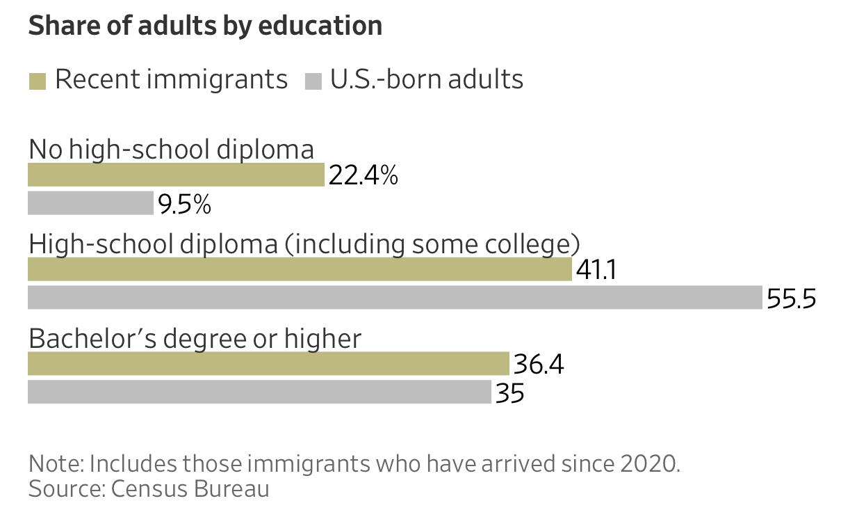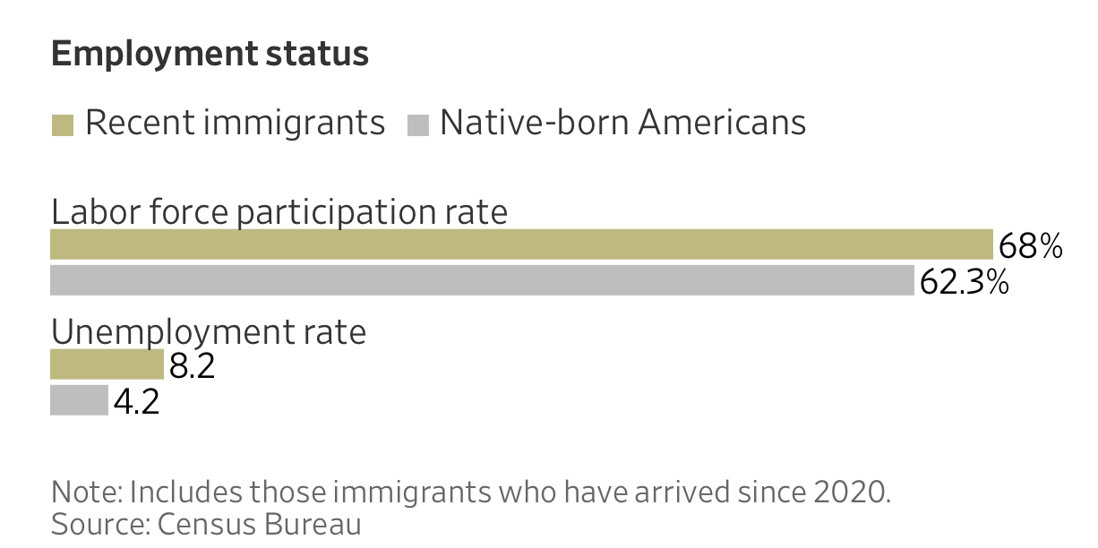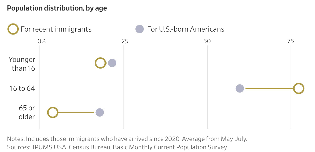2020년 이후로 유입된 이민자들 중 75% 이상이 16~64세 사이의 노동 가능 인구였습니다. 그리고 이 기간 유입된 이민자 중 불법 이민자들의 비중이 압도적으로 높다고 앞서 살펴봤죠? 따라서, 불법 이민자 중 압도적인 비중이 16-64세의 노동 가능인구였다는 추론이 가능합니다.