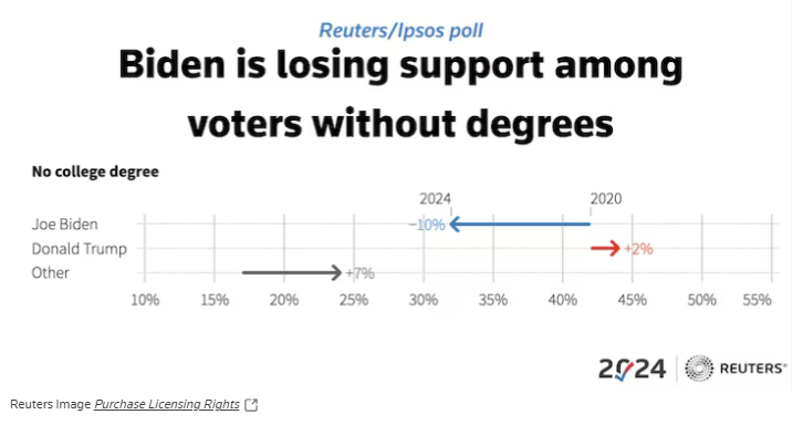 이 여론조사는 24년 6월 기준인지라 여전히 바이든 vs 트럼프이지만, 해리스로 바뀐 후에도 추세는 달라지지 않았습니다.