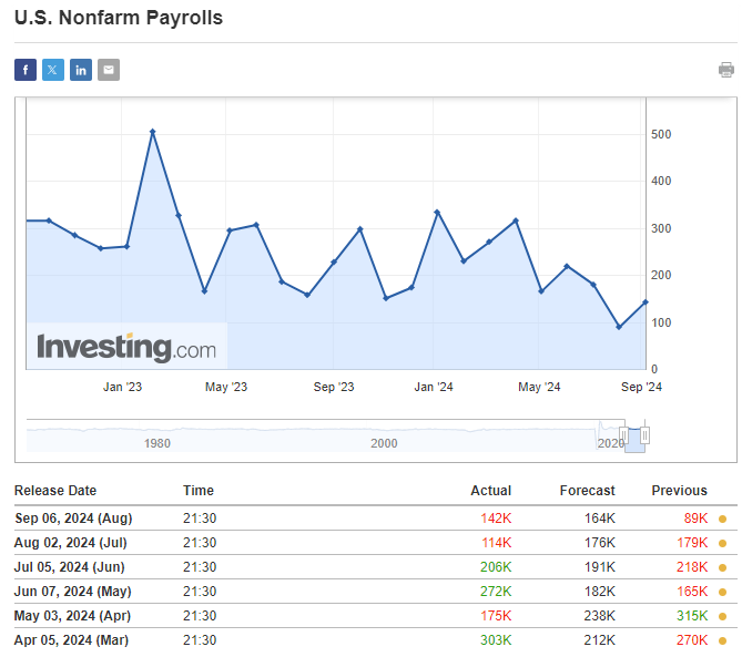 다음으로 중요한 기업조사 신규 일자리인 Non-farm payroll은 우선 예상치 164K를 하회한 142K가 나왔죠. 예상치를 하회한 것도 아픈데, 여기에 전월치가 114K에서 89K로 22% 가까이 하락 수정되었습니다. 신규 일자리 창출이 생각보다 더 부진하구나... NFP는 확실히 나쁜 소식이네요.