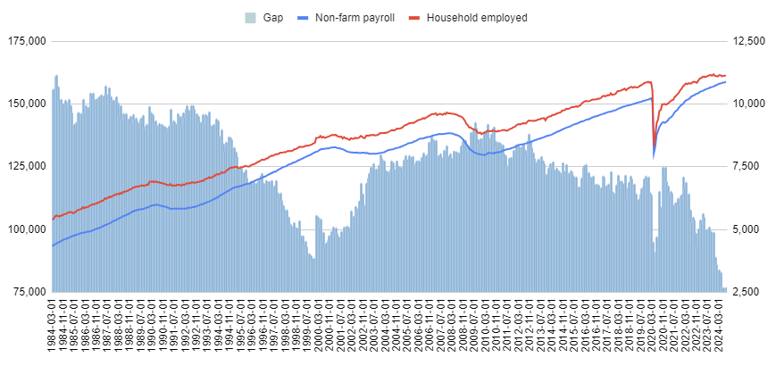 최근 포스트에서 다루었듯이 바이든 집권 동안 불법 이민자들은 역대급으로 유입되었습니다. 이들이 노동시장에 적극적으로 뛰어들면서 기업 조사에서는 payroll로 잡히지만, 불법 이민자가 정부 기관의 조사에 응할 확률은 언어 문제를 제외하고라도 상당히 낮죠. 내가 불법으로 미국에 들어와 있다면, 공무원 그림자도 피하고 싶지 않겠습니까? 그러다 보니 NFP와 가계 조사 취업자 수 간의 간극이 위 차트의 파란 막대처럼 계속해서 좁혀졌던 겁니다.