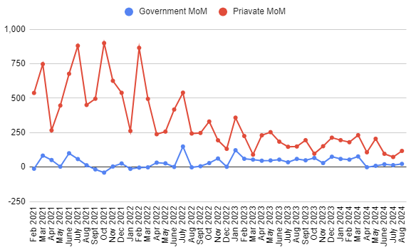 신규 일자리 중 정부 (파란선) 와 민간 (빨간선) 일자리 수 증감의 MoM 변화입니다.