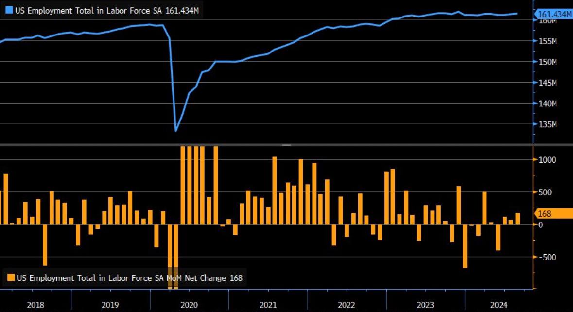 고용지표는 기업을 대상으로 한 조사와 가계를 대상으로 한 조사로 나뉘어집니다. NFP는 기업 대상 조사 결과고, 가계 대상으로 취업자 수를 동시에 집계하죠. 위 차트는 바로 이 가계 대상 취업자 수 추이입니다.