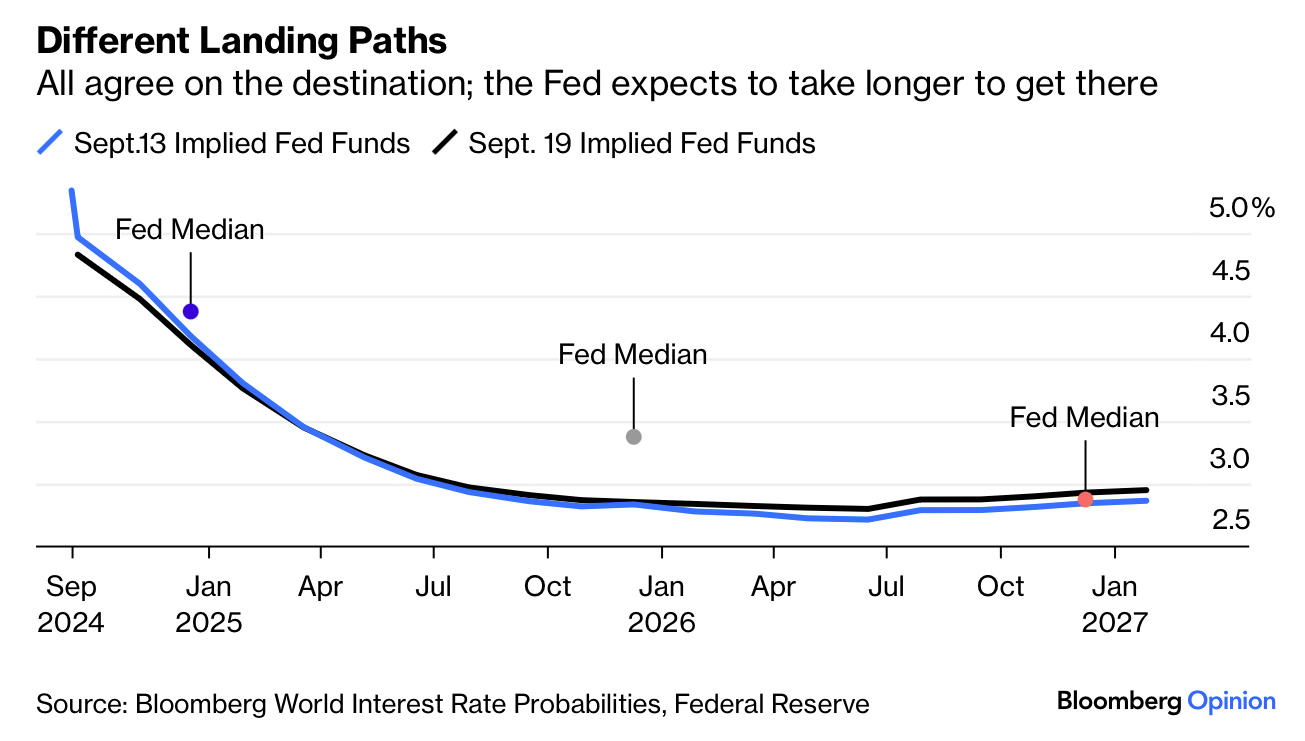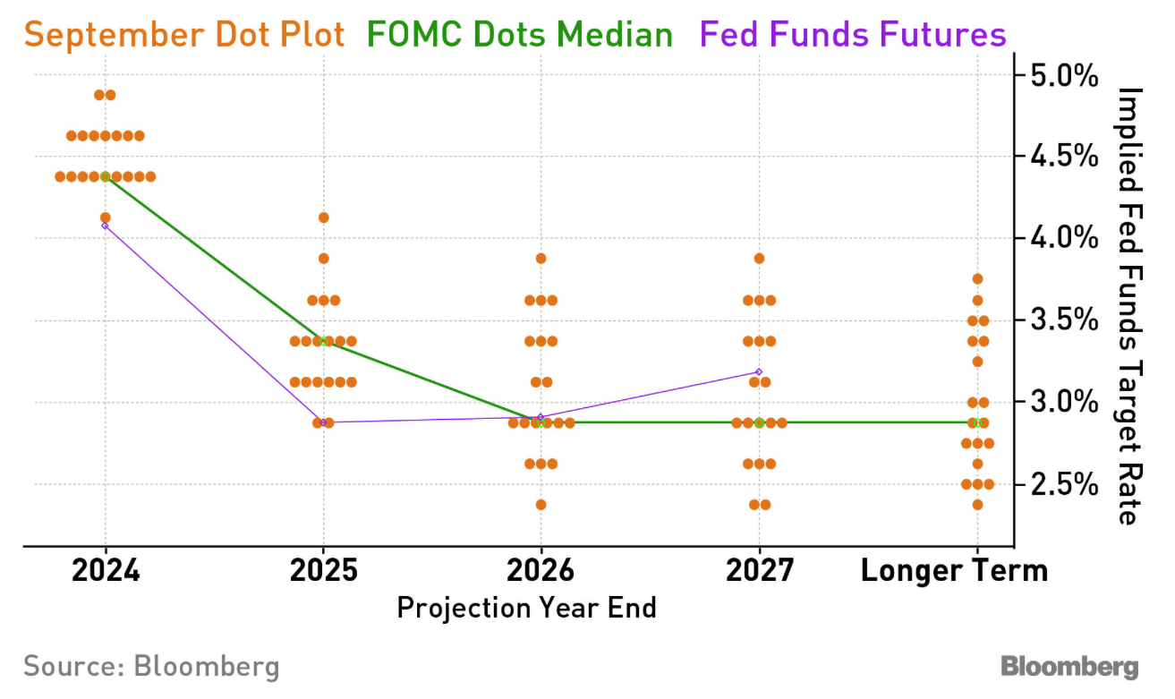 9월의 점도표 중앙값 기준 예상 추이 (초록선) 와 선물시장에 녹아있는 기준금리 예상 추이 (보라선) 를 보면 시장의 기대가 연준 점도표에 비해 월등히 앞서 나가고 있음을 알 수 있습니다. 이 내용을 다른 차트로 보면...