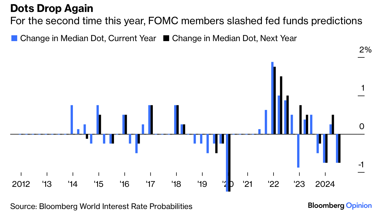 점도표의 당해 년도 중앙값과 (파란 막대) 다음 년도 중앙값 (검은 막대) 변화 추이입니다. 3월에 크게 낮아졌다가, 6월에 다시 올라갔다가, 9월에 또 크게 낮아진 거죠. 연준의 가이던스가 이렇게 오락가락하니 시장은 더 오락가락할 수밖에 없다고 생각합니다.