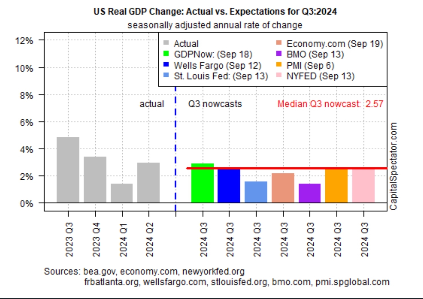 그렇다고 해서 당장 미국의 경제 성장 전망이 어두우냐... 3분기 미국 GDP 성장률에 대한 전망은 여전히 중앙값 기준 2.5%를 상회하는 매우 높은 레벨입니다.