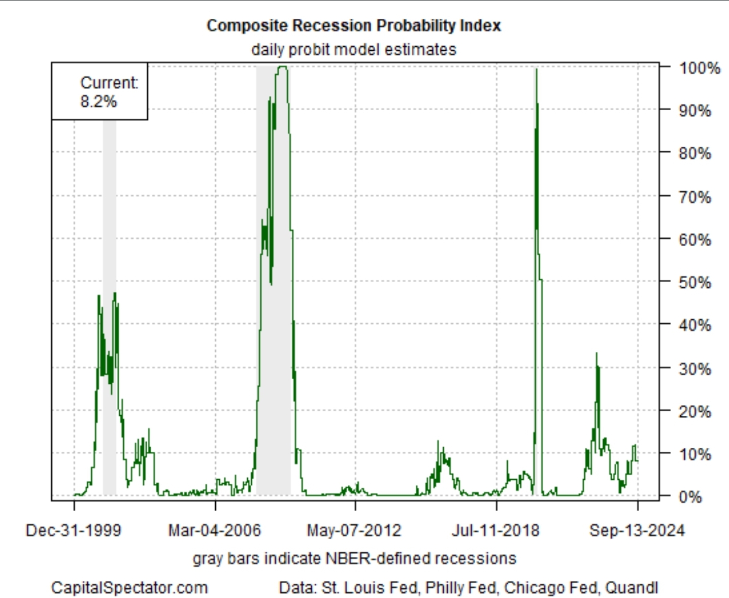일전에도 한 번 소개한 적이 있었던 Capital Spectator의 경기침체 확률 지수입니다. 현재 8.2% 수준으로 경기침체 임박에 대한 공포에 지배되기에는 낮은 레벨입니다.