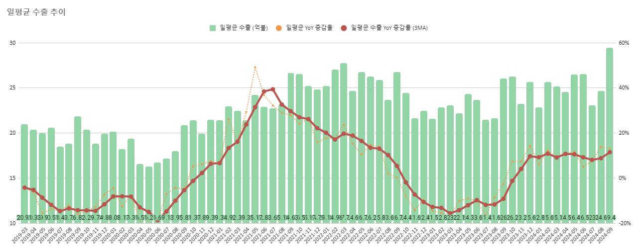 YoY 상승률 기준 13.1%나 상승하는 기염을 토했습니다. 9월 20일 중간 수출입 동향에서 YoY 상승률과 MoM 상승률로 9월 전체 수출금액을 추정해 보았을 때 상단이 대략 30억불, 하단이 26.4억불이었습니다. 그리고 실제 일평균 수출은 29.4억불로 상단에 거의 가까운 결과가 나왔죠.