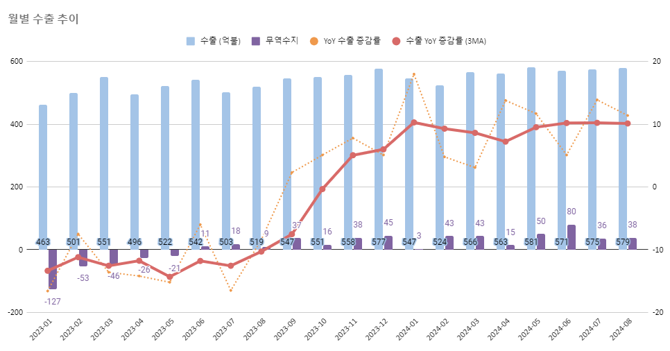 위 차트의 빨간선을 보면 일평균 수출의 YoY 상승률이 계속해서 ...