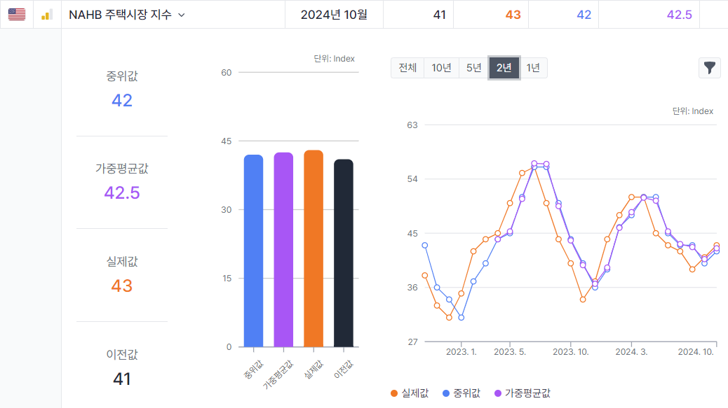 그래도 전반적인 주택시장은 점차 회복세를 보이고 있지 않나 싶어요. 물론 NAHB 주택시장 지수 기준입니다. 보시다시피 저점을 높이면서 오르는 추세가 이어지고 있습니다. 9월과 10월 2개월 연속 예상치 평균을 상회한 것도 고무적이네요.