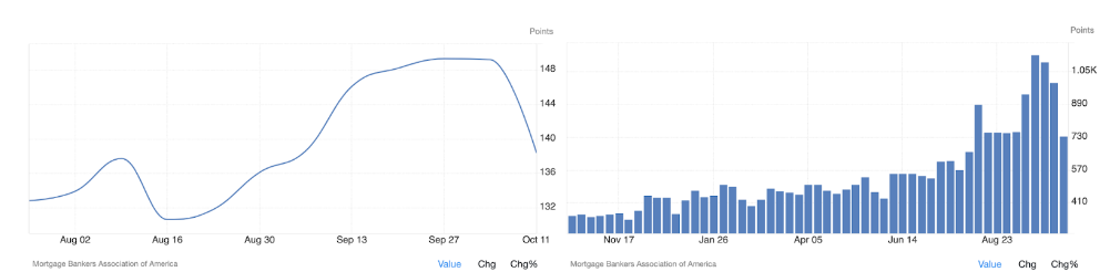 이렇다 보니 10월 들어서서 모기지 구매지수 (좌), 리파이낸싱 (재융자) 지수 (우) 모두 10월에 익은 벼모냥 크게 고개를 숙이고 있습니다. 금리의 변동성이 이렇게 크니 섣불리 움직이지 않는 편이 현명한 선택 같습니다.