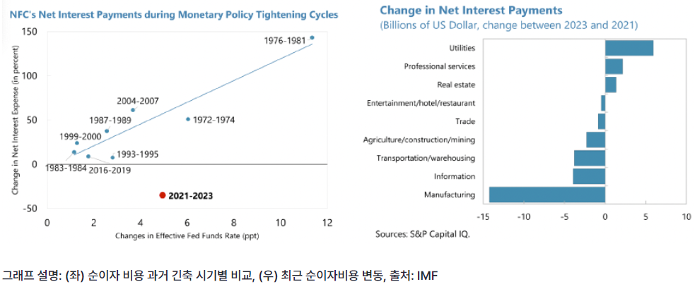 좌측 차트부터 봅시다. 이 차트는 비금융기업들의 역대 긴축 시기 별 순이자 지출을 보여줍니다. 점 하나가 하나의 긴축적인 통화정책 시기를 나타냅니다. X축은 기준금리의 변화율을 나타냅니다. 가장 우측 상단에 1976-1981이 있죠? 폴 볼커의 업적입니다. 점들이 우상향 추세를 이루고 있는 것이 보이죠? 무슨 의미냐... 연준의 기준금리 인상폭이 크면 클수록 기업들의 이자비용이 선형적으로 증가했다는 의미입니다. 과거의 긴축적인 통화정책이 기업의 이자비용을 높여 경기둔화를 이끌어냈음을 보여주는 거죠.