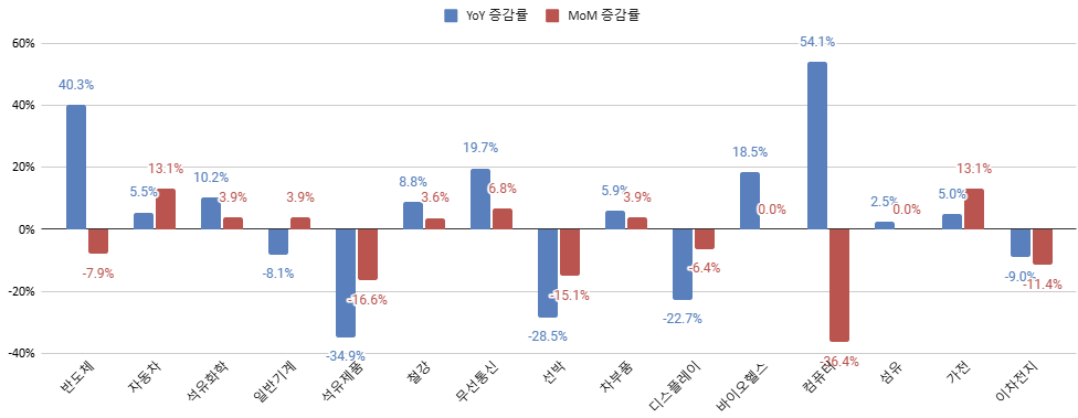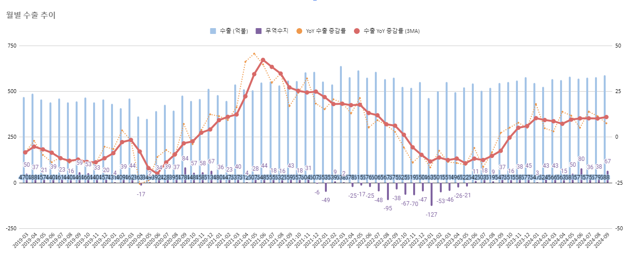 품목 별로 보면 반도체는 전월 대비로는 감소했지만 전년 대비로는 여전히 좋은 흐름을 이어가고 있고, 자동차, 무선통신이 좋은 흐름을 계속 이어가고 있네요. 컴퓨터 (SSD 포함), 이차전지는 9월을 정점으로 한풀 꺾이는 모양새입니다.