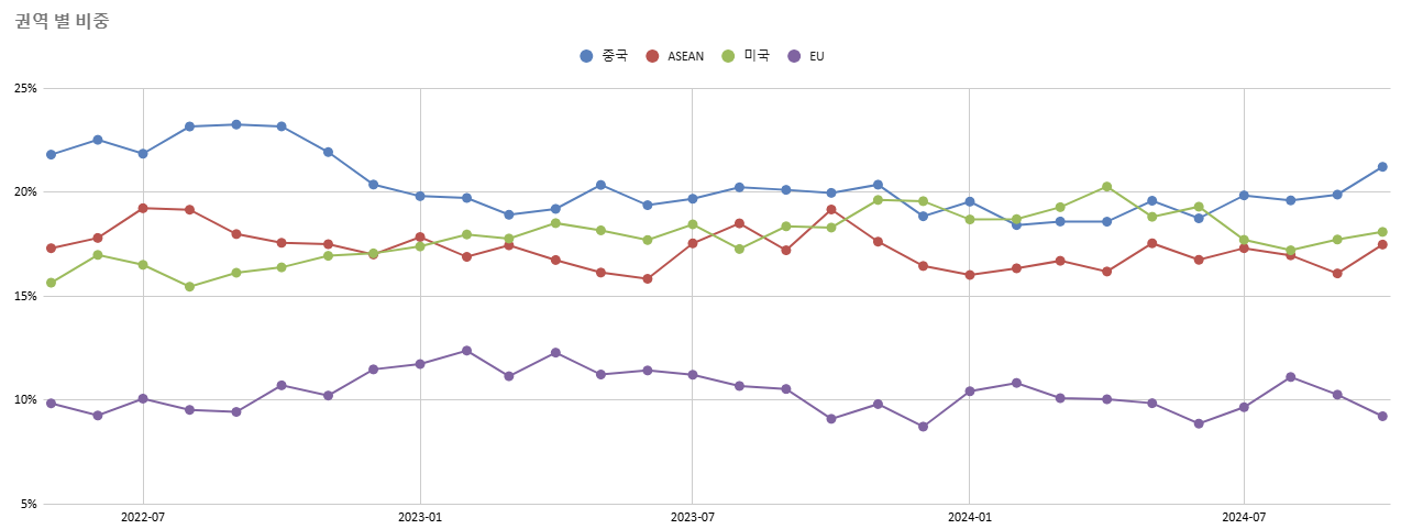 주요 권역별 비중... 중국의 비중이 계속 늘어납니다. 올해 초만 해도 미국에 밀려 2위였는데...