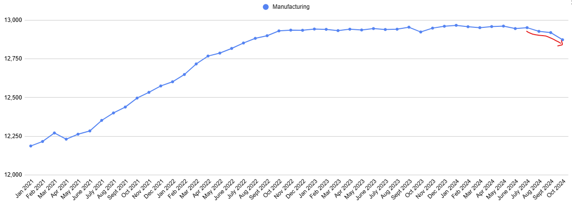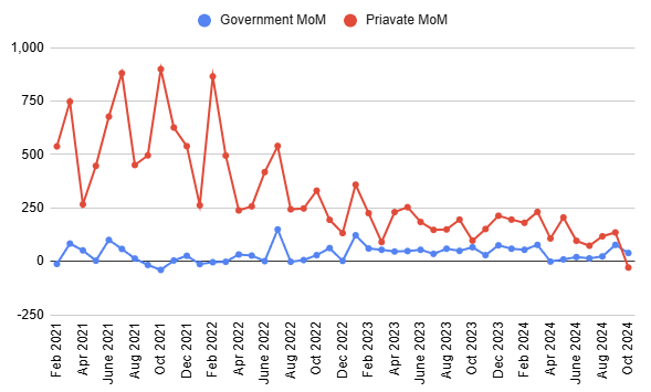 빨간선은 민간 일자리의 MoM 변화, 파란선은 정부 일자리의 MoM 변화. 9월에 이어 10월에도 정부 일자리가 늘어납니다. 반면, 민간 일자리는 10월에는 오히려 마이너스로 감소했어요. 민간에서는 헬스케어와 건설 정도를 제외하면 대부분 일자리가 감소하고 있습니다.