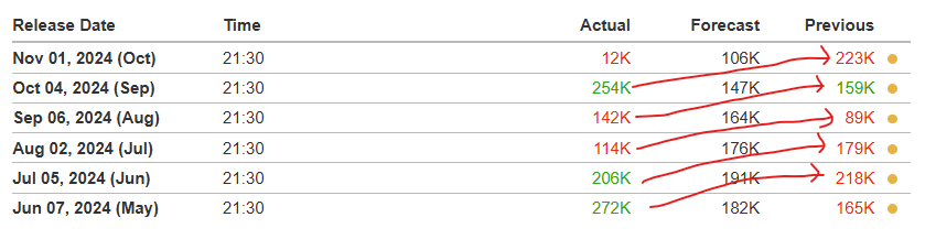 그리고... 하단의 빨간 화살표를 보면 전월치 수정이 계속해서 큰 폭으로 일어나고 있죠? 화살표 5개 중 4개가 최초 발표치에 비해 하향 조정되었습니다. 다음 달 초에 발표되는 추정치는 응답률이 낮아, 그 다음달 추정치를 발표할 때 응답률을 높여 수정치를 발표하는데 거의 대부분 하향 조정되고 있습니다. 10월 NFP는 과연 얼마나 조정되려나...