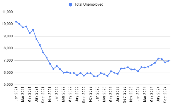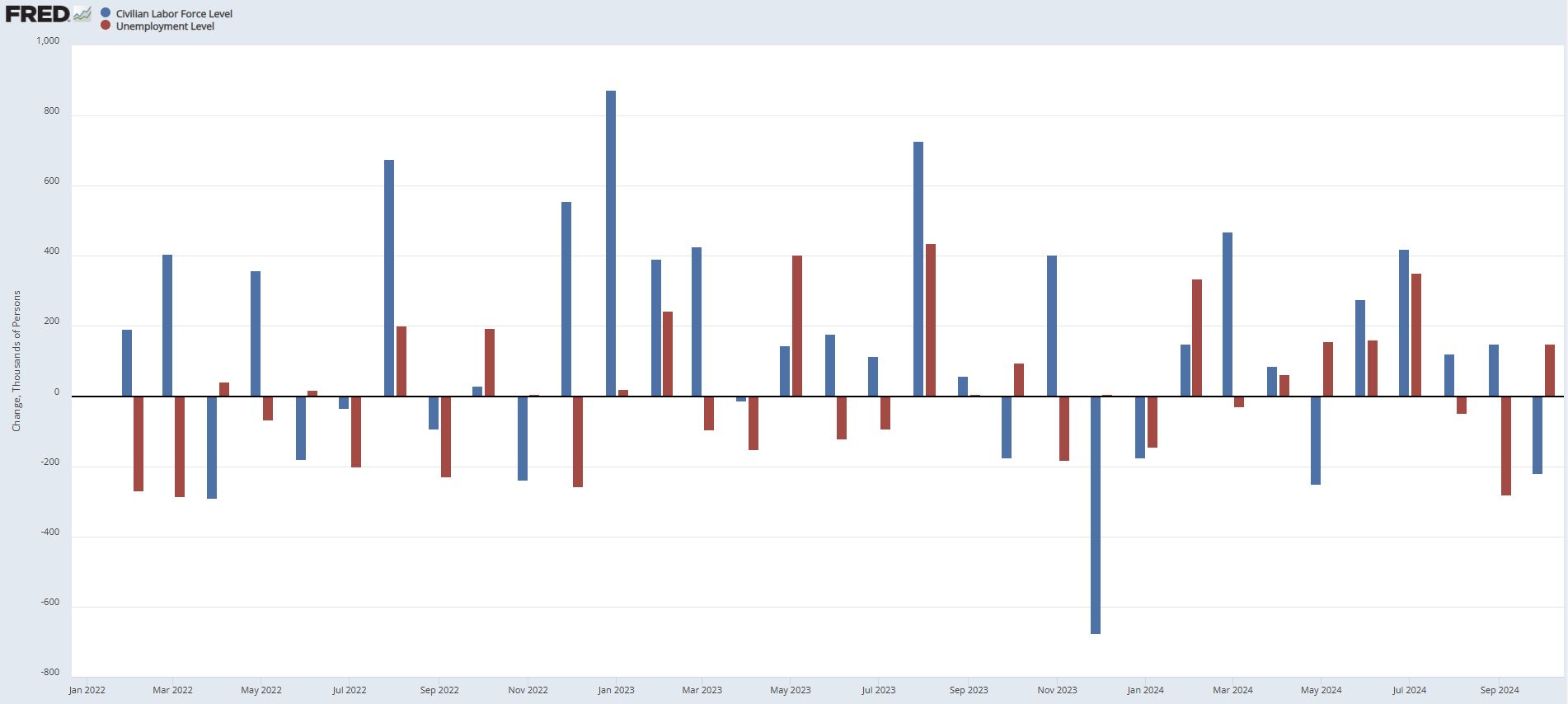 실제로 데이터를 보면 노동가능인구 변화 (파란 막대), 실업자 수 변화 (빨간 막대)... 10월을 보면 실업자 수가 늘었지만, 경제활동인구는 감소한 것을 알 수 있습니다. 묘하네요. 실업자 수가 늘고, 경제활동인구 수가 감소했다면 실업률은 올랐어야 맞는데 똑같이 4.1%다?... 계산을 해봅시다.