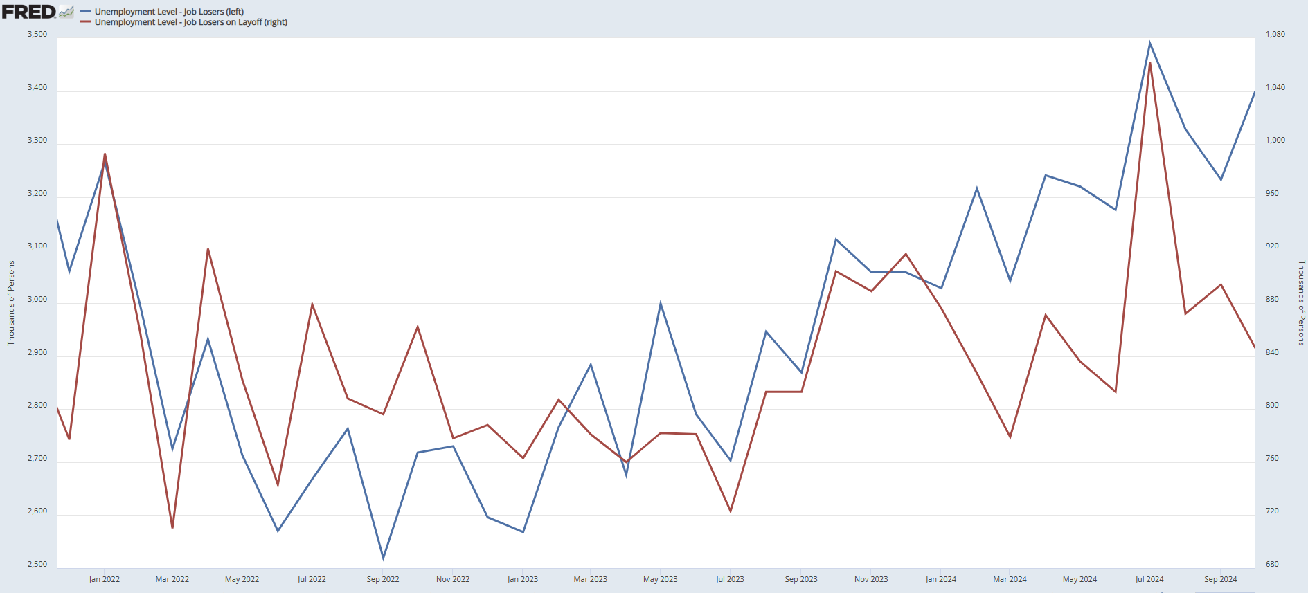 실직자 수는 계속해서 늘어나고 (파란선), 정리해고로 직장을 잃은 실직자 수도 늘어나고 있습니다 (빨간선). 전체 실업자 수도 아무래도 증가세가 유지되고 있겠군요. 살펴보면...