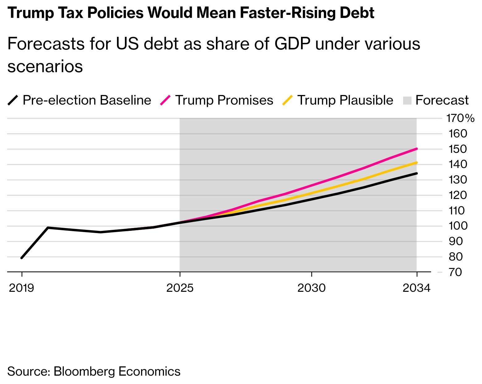 Bloomberg Economics 팀의 2034년까지의 GDP 대비 정부부채 예상치입니다. 빨간선은 트럼프 공약이 충실히 이행되었을 경우, 노란선은 Bloomberg Economics 팀의 판단에 실제로 이행 가능할 것으로 보이는 트럼프 공약들이 실행되었을 경우, 검은선은 트럼프 당선 이전의 추정치입니다.