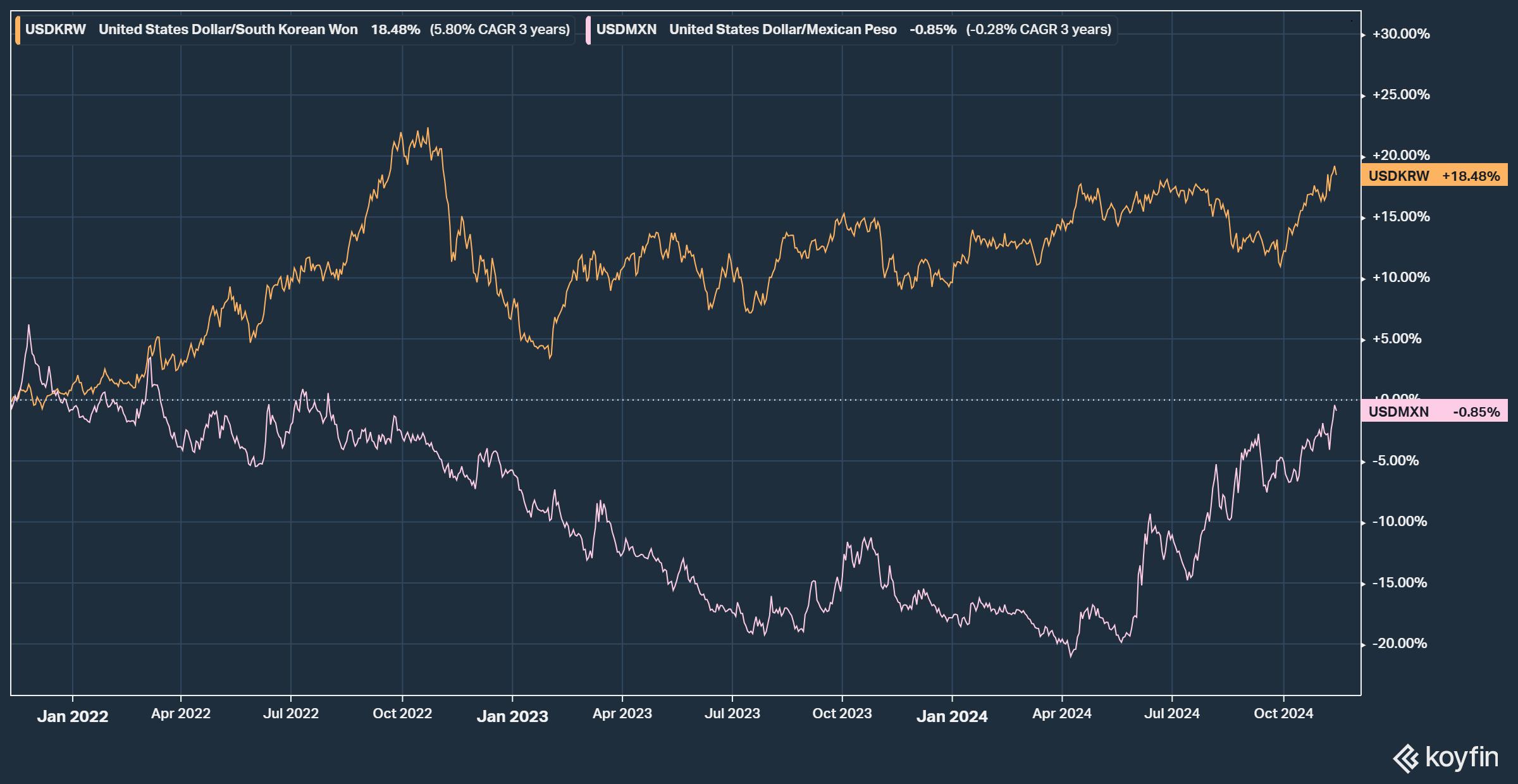USD/KRW (주황선), USD/MXN (보라선) 환율을 비교해 보면 멕시코의 CDS 프리미엄이 높아지면서 동시에 USD/MXN도 급등하고 있습니다. 반대로 USD/KRW는 최근 급등하고는 있지만 상승세 측면에서는...