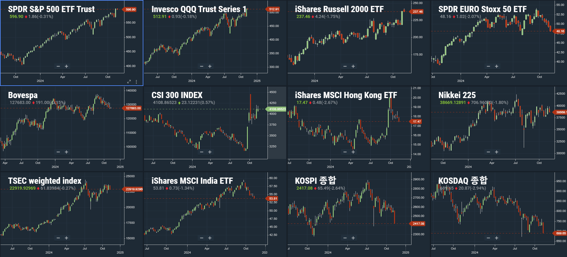 우측 하단 코스피와 코스닥과 나머지 주요국 주가지수를 비교해 보세요. 위 차트에 나와있는 어느 나라 주가지수도 23년 11월 저점을 위협하는 나라는 없죠? 코스피는 아직 23년 11월 저점보다 높지만, 코스닥은 이미 아래로 쳐져있습니다.