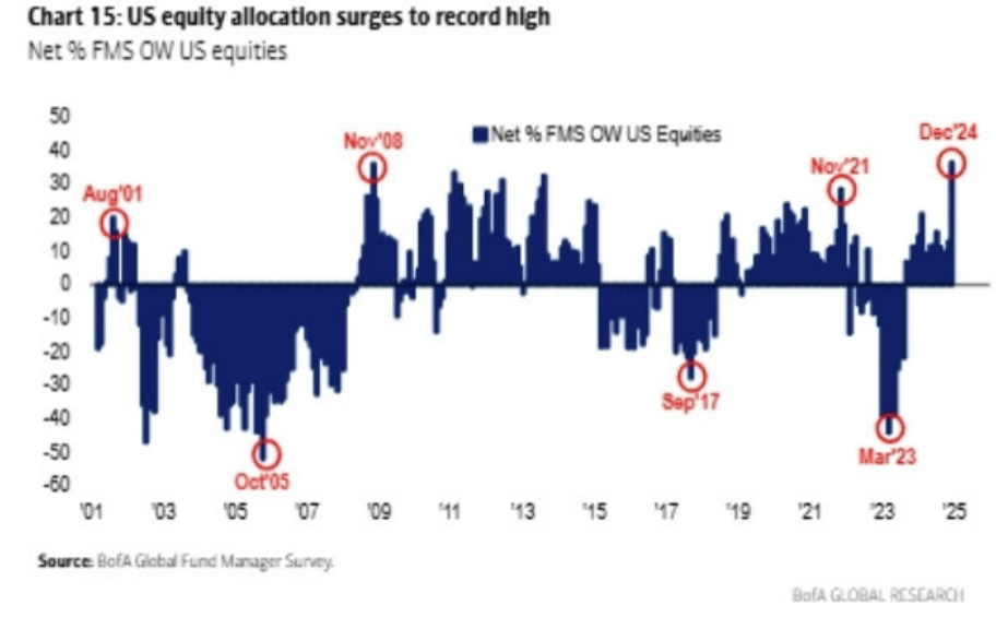 가계와 액티브 투자자만이 아닙니다. 12월 펀드매니저 서베이를 보면 기관투자자들의 미국 주식 보유 비율은 2001년 이래 최고 수준에 ...