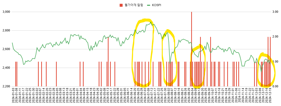 살펴보니 24년 상반기까지만 해도 배포 빈도 자체가 높지 않았기에 이렇다 저렇다 판단이 어려웠지만, 하반기로 넘어오면 지수의 추세 변화와 칼럼 배포 빈도 수 간의 상관 관계가 좀 보이죠? 노란 형광펜 구간들을 보면 지수가 고점에서 조정, 저점에서 반등하는 구간에서 빨간 막대들의 군집도가 늘어나 있습니다. 묘하죠?