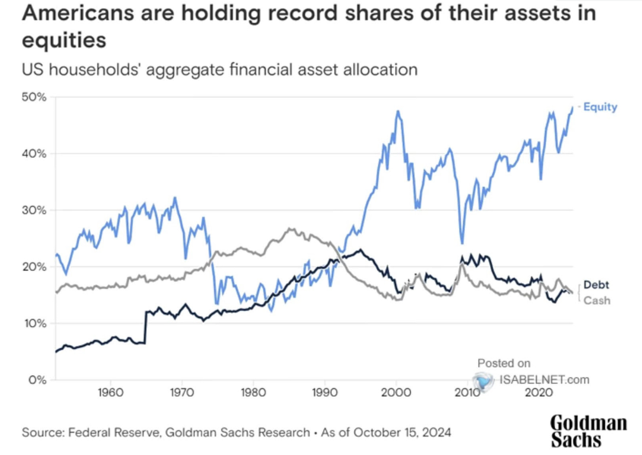 미국 증시의 멈추지 않는 질주가 가능했던 이유는 꾸준히 매수하는 이들이 있어서겠죠? 그 말은 주식 자산에 대한 노출도가 매우 높아져 있을 것이라는 의미입니다.