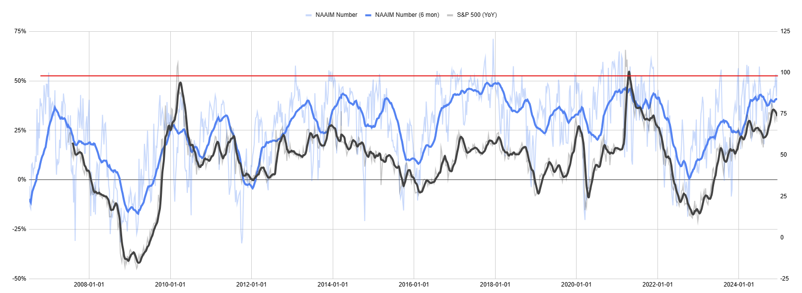 NAAIM (미국 액티브 투자자 협회) 의 주식 노출도 (파란선) 는 역대급 고점에 근접해 있습니다. 역대 최고 수준이라고 보기는 어렵지만 더 치고 올라갈 룸은 별로 보이지 않죠.