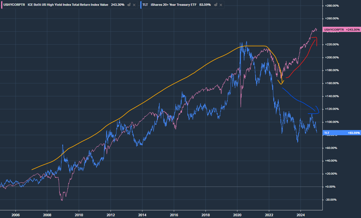 그런데, 그 뒤로 장기국채 가격 (파란 화살표) 과 하이일드 채권 가격 (빨간 화살표) 의 경로는 크게 갈라집니다. 즉, 22년 하반기 이후로 국채금리는 오르고, 하이일드 금리는 내렸다는 거죠. 앞서 짚어보았던 하이일드 스프레드가 하락하기 위한 조건이 모두 성립하는 셈입니다.