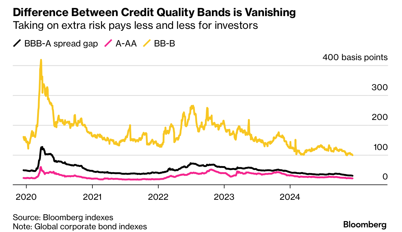 무슨 의미죠? 신용등급이 낮은 채권의 금리와 높은 채권의 금리차가 줄어든다는 것은 시장 참여자들이 등급이 낮은 기업들의 부도 확률을 낮게 보고 있다... 전반적으로 기업 부도 리스크를 낮게 평가하고 있다는 의미로 해석할 수 있습니다. 직전에 기업들의 신용등급이 전반적으로 높아지고 있다는 상황과 일맥상통하는 부분이 있죠? 신용평가사들의 평가가 공정하다는 전제 하에... 말입니다만 ㅎㅎ