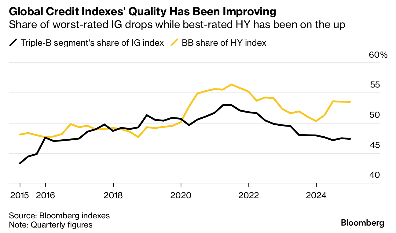 노란선은 하이일드 중 가장 높은 등급인 BB의 비율입니다. 24년에 들어와 크게 증가하고 있죠. 이는 하이일드 그룹 내에서도 전반적인 신용등급 상승이 이루어지고 있다는 뜻이 되죠.