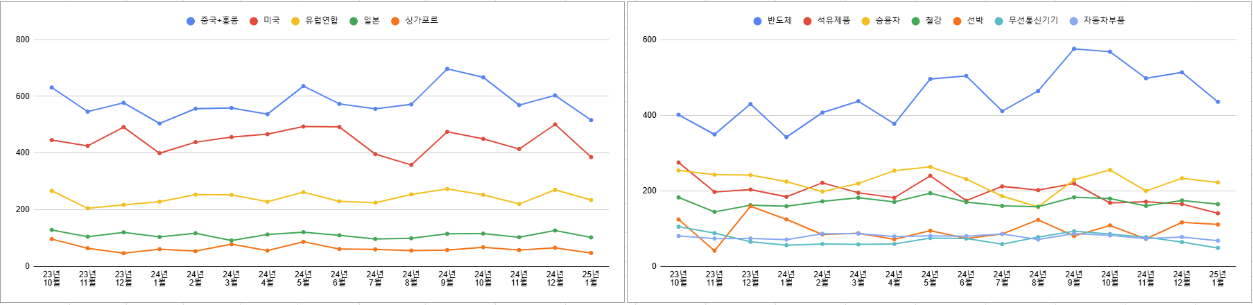 우측 품목별 수출을 보면 파란선 반도체만 강한 모습이 이어지고 있습니다. 전년 동월로 보아도 오직 반도체만 증가했죠. 다만, 반도체 일평균 수출도 24년의 강한 상승세를 유지하지는 못하는 모습입니다. 나머지 품목들이야 보시다시피 24년에도 맥을 추지 못했구요. 또 하나... 선박 품목의 수출은 24년 중순 이후 서서히 고개를 들고 있습니다. 최근 강한 주가를 보이는 이유가 여기서 나오는 것일지도 모르죠.