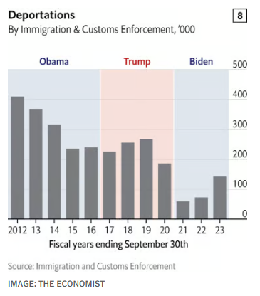 단순히 많이 유입된 것만 문제가 아니라 불법 이민자의 추방 건 수도 급격히 감소했습니다. 국경을 열어두어 불법 이민자들의 유입을 방치한 것도 모자라 유입된 이들을 추방하려는 노력조차 하지 않았다고 볼 수 있죠.