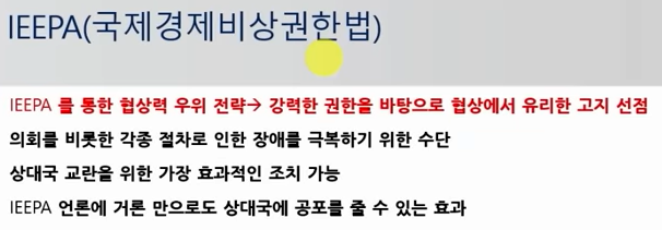 그래서 트럼프가 만지작거리는 카드가 바로 IEEPA (International Emergency Economic Powers Act), 국제 경제 비상 권한법입니다.