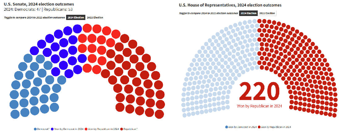 가장 우측을 보면, 2024년 선거를 통해 공화당은 red sweep을 달성했습니다. 의회 구성을 보면...