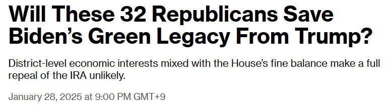 여튼... 기사에서는 공화당 하원의원들의 과거 환경법안 관련 투표 성향, 지역구의 중요도 등을 고려해 점수를 매겼는데 대략 32명 정도가 IRA 폐기 내지는 개정에 반대할 가능성이 높다는 이야기입니다. 공화당에서 32표는 고사하고 절반인 16표만 빠져도 IRA는 손 볼 수가 없는 노릇이고, 트럼프의 에너지 패권 목표는 달성이 요원해진다는 겁니다.