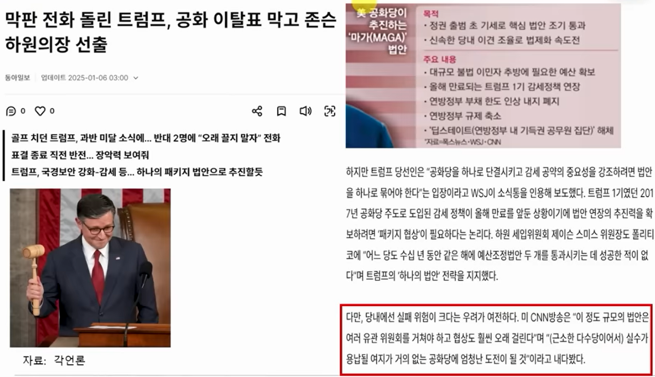 현재 하원의장인 마이크 존슨의 연임이 트럼프의 막판 가세로 가까스로 이루어졌습니다. 하원의장 선출이 그다지 논란이 될만한 사안도 아니었고, 법안 개정 및 통과처럼 복잡한 협상과 정치력이 필요한 사안이 아니었는데도 공화당 단일대오를 구성하기가 어려웠다는 거죠.