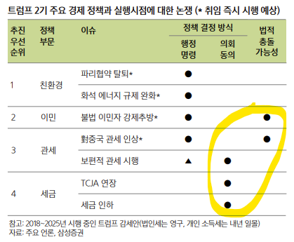 이처럼 아주 슬림한 다수를 점하고 있는 공화당이 강철대오로 뭉쳐 트럼프의 아젠다를 강력히 밀어줄 것인지에 대한 의구심은 상당합니다. 그리고, 이 모든 난관을 잘 헤쳐나간다 해도 법안의 협상, 통과, 시행에는 물리적인 시간이 걸립니다. 즉, 트럼프 2.0은 트럼프 1.0에 비해 공화당 장악력이 훨씬 강해진 것은 분명한 사실이지만, 그렇다고 공화당이 트럼프의 손아귀에 완전히 사로잡혀 강철대오로 트럼프를 밀어줄 상황은 아니라는 겁니다.