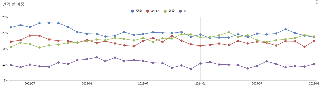 수출 비중을 보면 미국과 중국이 감소하고, 아세안과 EU가 증가했습니다. 비중이니까 미국 중국의 줄어든 비중이 EU와 아세안의 ...