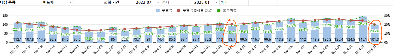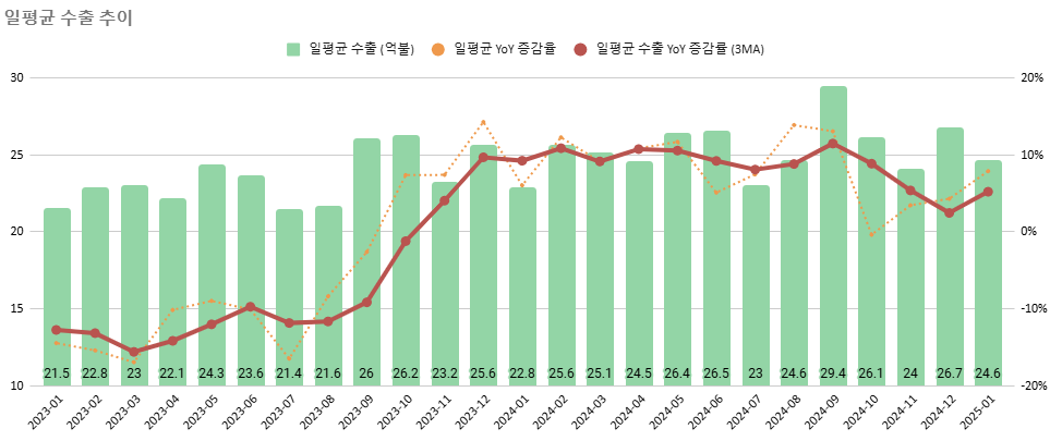 일평균 수출 추이는 사뭇 다르죠? 1월 일평균 수출은 2450억불... 빨간선 YoY 상승률이 상승 반전했습니다. 24년 11월보다도 좋은 수치가 나왔는데 이건자주 있는 일이 아니에요. 그만큼 25년 1월 일평균 수출은 좋았습니다.