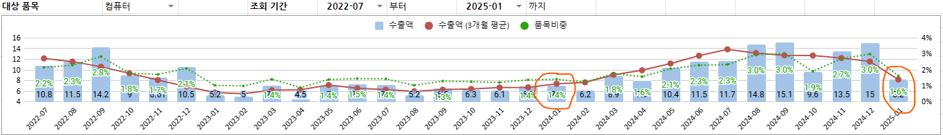 그러면... 조업일이 적었음에도 불구하고 전체 수출액이 늘어난 업종은 상대적으로 수출이 강하다고 판단할 수 있겠죠? 25년 1월에 YoY로 수출이 증가한 업종은 뭘까요? 바로 반도체와 컴퓨터입니다.