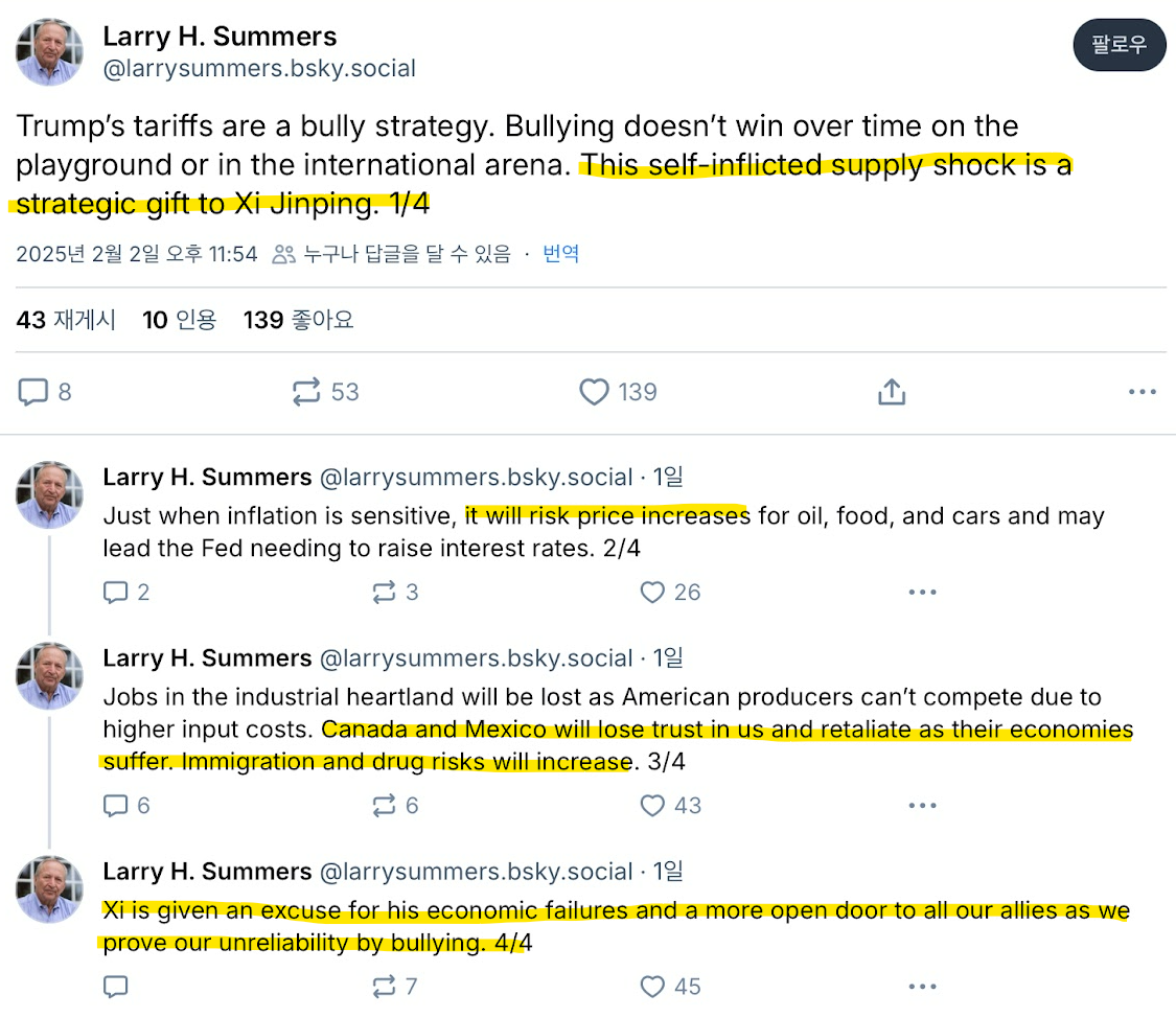 레리 서머스가 이번 관세조치가 끔찍한 이유를 4가지 들었습니다. 다 맞는 말이죠.