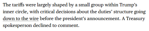 이번 관세정책은 트럼프 이너서클의 극소수 인물들에 의해 대부분 추진되었다... 또 다른 관련기사에서는 이 소수의 이너서클에는 트럼프에 맹목적 충성을 바치는 피터 나바로, 하워드 러트닉이 포함되어 있었으며, 이들은 트럼프의 충동을 오히려 부추기고 있다고 합니다. 또한, 이번 관세 정책이 발표되는 마지막 순간까지 핵심 사안들에 대한 조정이 이어지고 있었다고 하니... 얼마나 졸속하게 마련된 정책인지 알 수 있습니다.