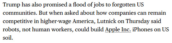 산업정책을 총괄하는 상무장관 러트닉은 미국으로 일자리를 되찾아 와서 로봇에게 주겠다고 한다.