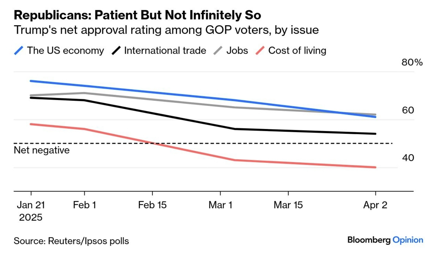 미국 경제와 글로벌 무역, 일자리, 물가에 대한 공화당 지지자들의 트럼프 지지율은 계속해서 흘러내리는 중입니다. 특히, 물가에 대해서는 상당히 안좋죠.