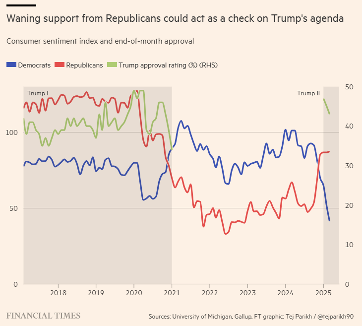 미시건대 소비자 설문조사를 기반으로... 지지정당 기준으로 보아도 파란선 민주당 지지자들의 소비자 심리는 계속해서 바닥으로 내려앉고 있죠. 문제는 빨간선 공화당 지지자들의 심리인데... 보시다시피 정체되었습니다. 한동안은 두 라인이 반대로 움직였지만, 이제 민주당 지지자들 심리는 계속해서 나빠지는 와중에 공화당 지지자들 심리는 더 이상 좋아지지 않고 있죠. 트럼프 2기 지지율인 초록선도 하락세입니다.