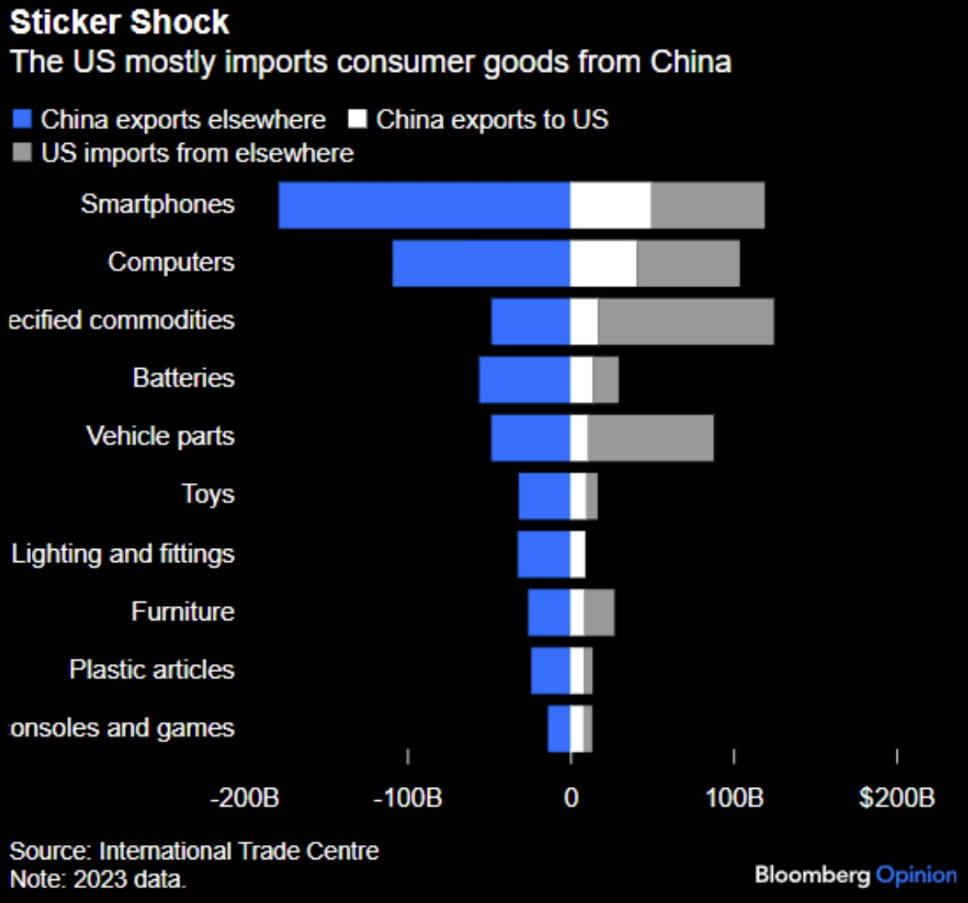 차트의 하얀 막대를 보면... 중국의 대미 수출 중 가장 큰 비중은 스마트폰, 컴퓨터, 정제된 원자재... 여기에 가구, 의류 등 주로 완성품 소비재의 비율이 매우 높습니다. 관세가 적용되면 미국 소비자들은 데미지를 즉각적으로 입게 됩니다. 미국 소비자들이 결국 고통을 감내해 가며 트럼프의 관세전쟁에 동참해 주어야 한다는 이야긴데...