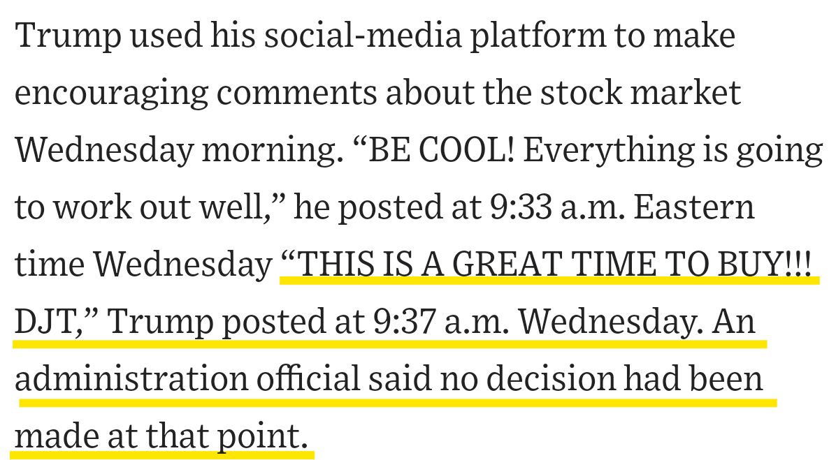 이 부분도 정정해야겠네요. 발표 이후 베센트가 전면에 나선 것으로 보아 트럼프가 그의 의견을 적극 수용하기 시작했다고 보아야 할 듯 합니다. 그럼에도 불구하고, 트럼프는 본인의 입이 시장을 움직이는 상황을 만드는 것에는 여전히 진심이라고 생각합니다. 본인이 buy 콜을 던진만큼, 시장이 상승하도록 만들기 위한 조치를 취할 가능성이 높다고 여전히 생각 중입니다.